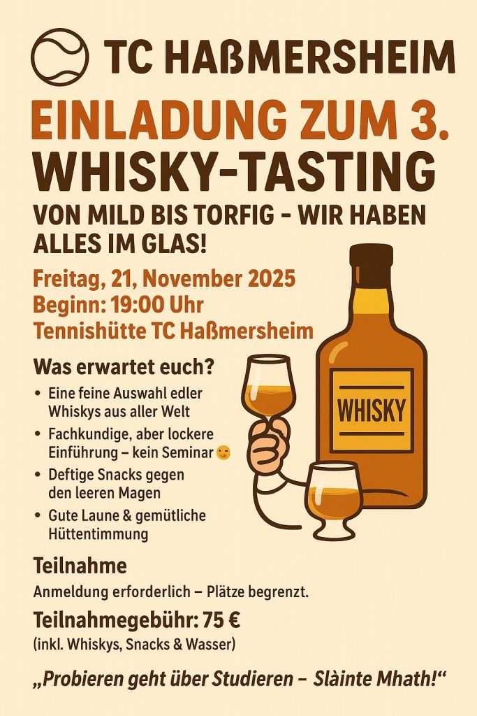 - 🥃 Einladung zum Whiskytasting auf der Tennishütte 🎾Liebe Freunde des guten Geschmacks,am Freitag, 21. November 2025, verwandelt sich die Tennishütte des TC Haßmersheim in einen Ort feinster …